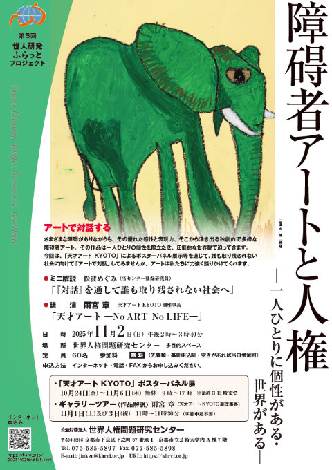 そんなご縁のもと、オフィスの京都市立芸術大学キャンパスへの移転を機に同センターが本年から新たに進める「ふらっとプロジェクト」の第5回「障害者と人権」と協働…市立芸術大学の学園祭(11月1日〜3日)をコア会期に設定して初開催の運びとなりました。
